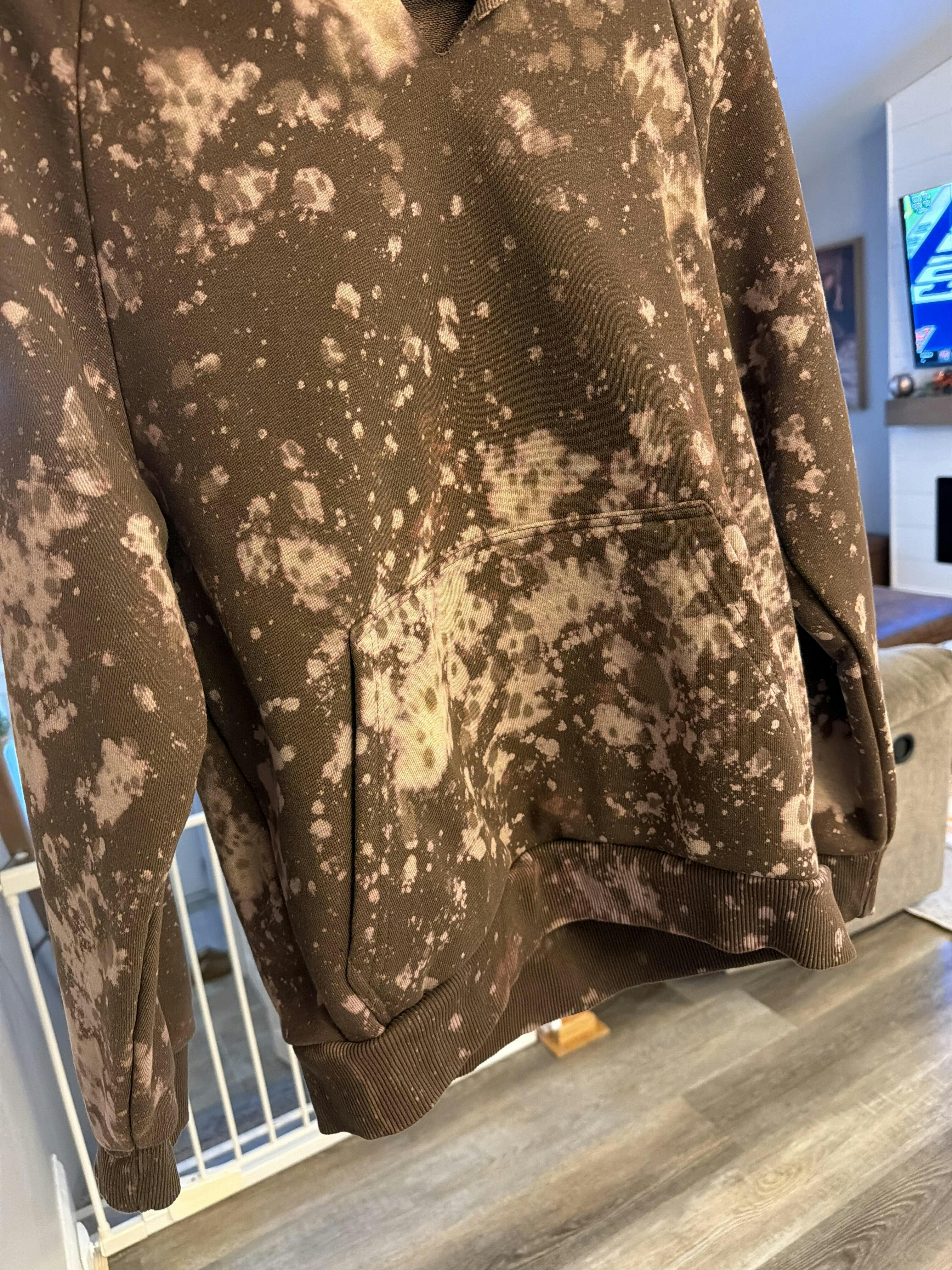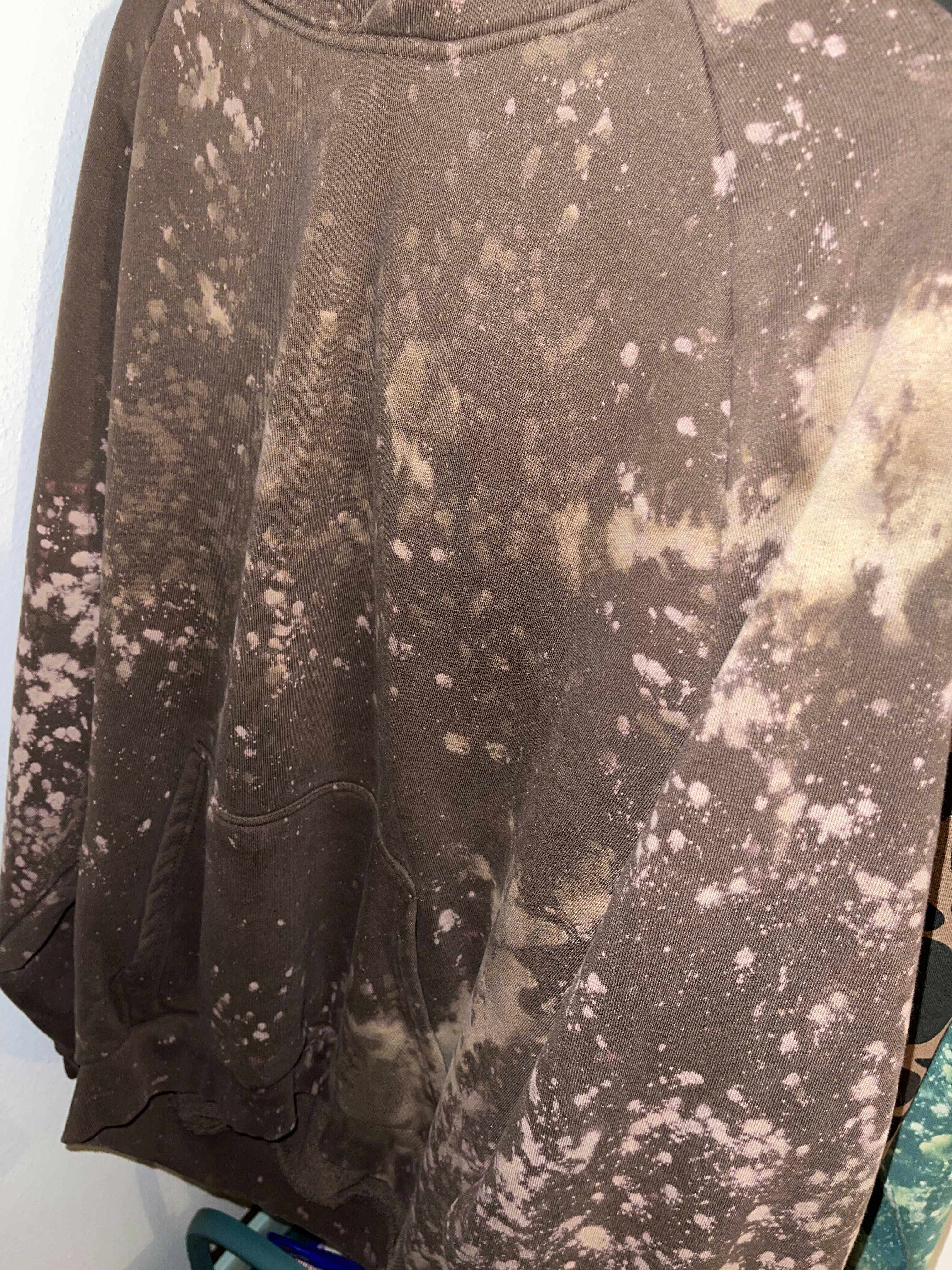 Each hoodie is hand bleached, making it look like an agate, North Shore rock. Some hoodies show hues of pinks/organge, others do not and are more dull in color. These brown bleached vintage hoodies are uber heavy in weight and have Regan sleeves. Cute white tree logo on the sleeve.
