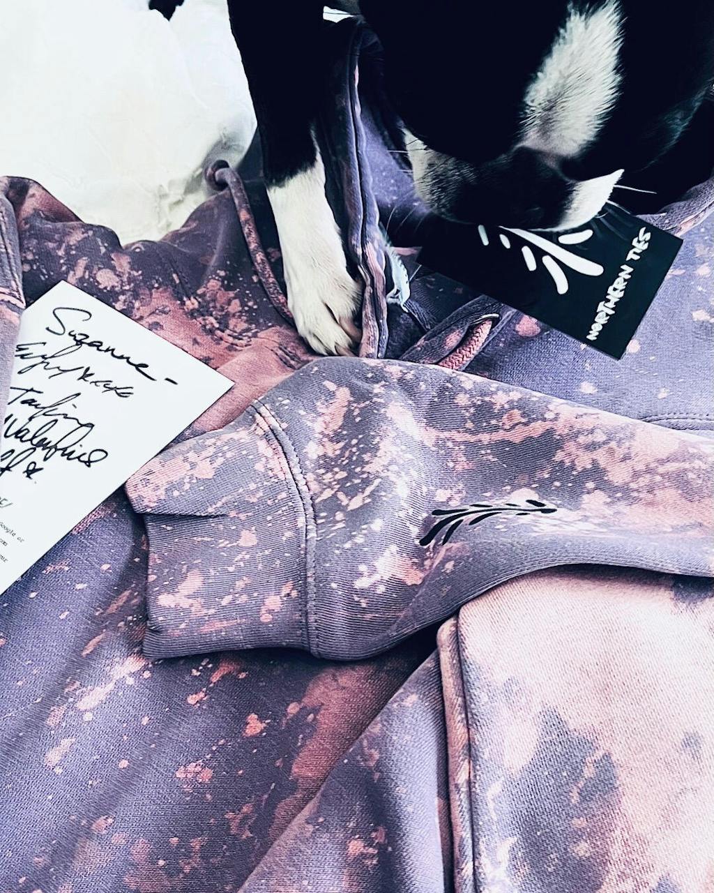 Each hoodie is handmade by using a technique known as reverse tie dye or acid wash -- a technique that uses a bleach solution to chemically change fabric colors with organic, one-of-a kind results. Handmade in Monticello, Minnesota. Please note some have more pink and/or white (bleach) than others. I do my best to match the photos.